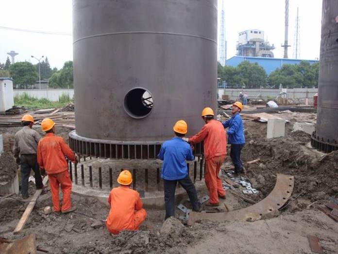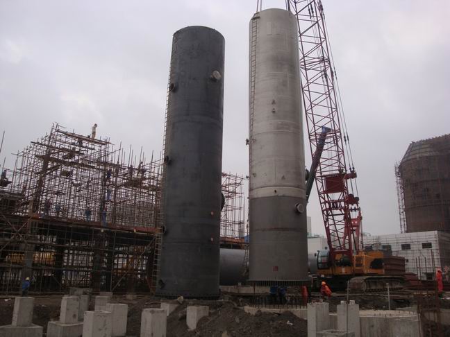 我公司承建的上海石洞口二电厂二期660MW脱碳工程已于今日正式施工,工期紧、任务急,经过精心准备,职工们昼夜施工,仅用二十二个小时的紧张施工于今日早晨七点将单节高度40.5米吸收塔和再生塔下段顺利安装就位。